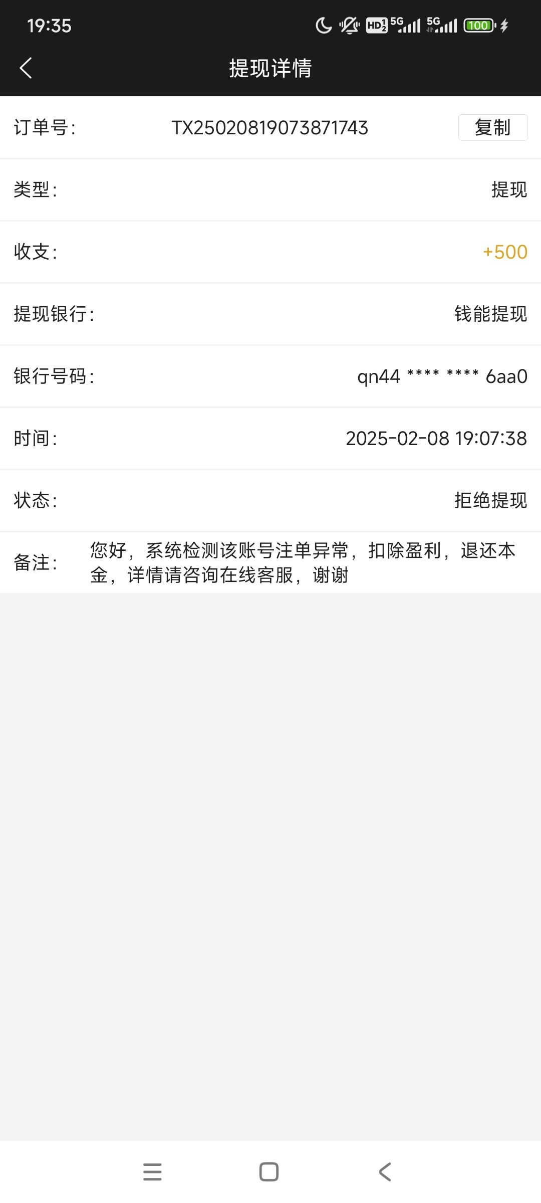 有个几个月没玩的号上去看到钱能还有10,充了去打PG赢了几块然后进AG街机,出来提100,然后扣掉,说套利彩金,我他妈都没领过彩金就直接是本金进游戏的,退回来10块之后我又进动物狂欢直接单压红狮子赢了500,提了又扣了,这次直接说注单异常,我一直以为662不会充值黑,以前试过几次充10块20块出一两千的,现在真没想到啊这出生台搞这出,狗庄活不起了